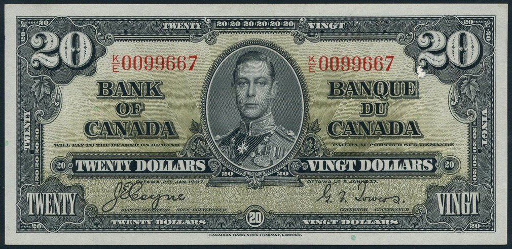 (x) Bank of Canada, $20, 2 January 1937, serial number K/E0099667, black on olive green underprint, portrait King George VI at centre, denomination in English and French, reverse, olive green, allegorical figure at centre