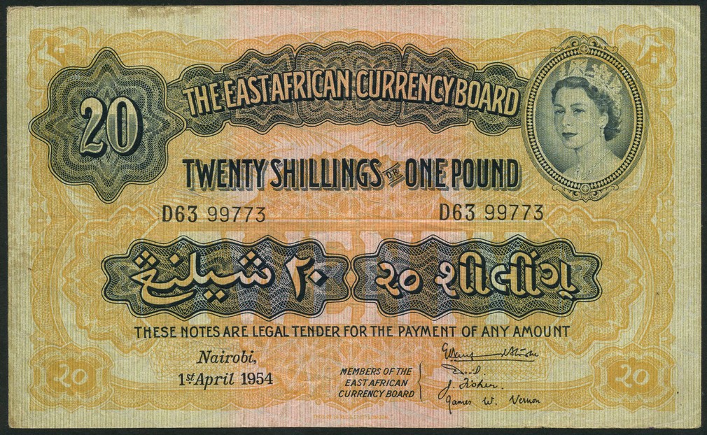 East African Currency Board, 20 shillings (2), 31 March 1953 and 1 April 1954, prefixes D46 and D63, dark blue on yellow and multicolour underprint, Elizabeth II at top right, value at centre, top left and each corner, reverse orange, lion at centre