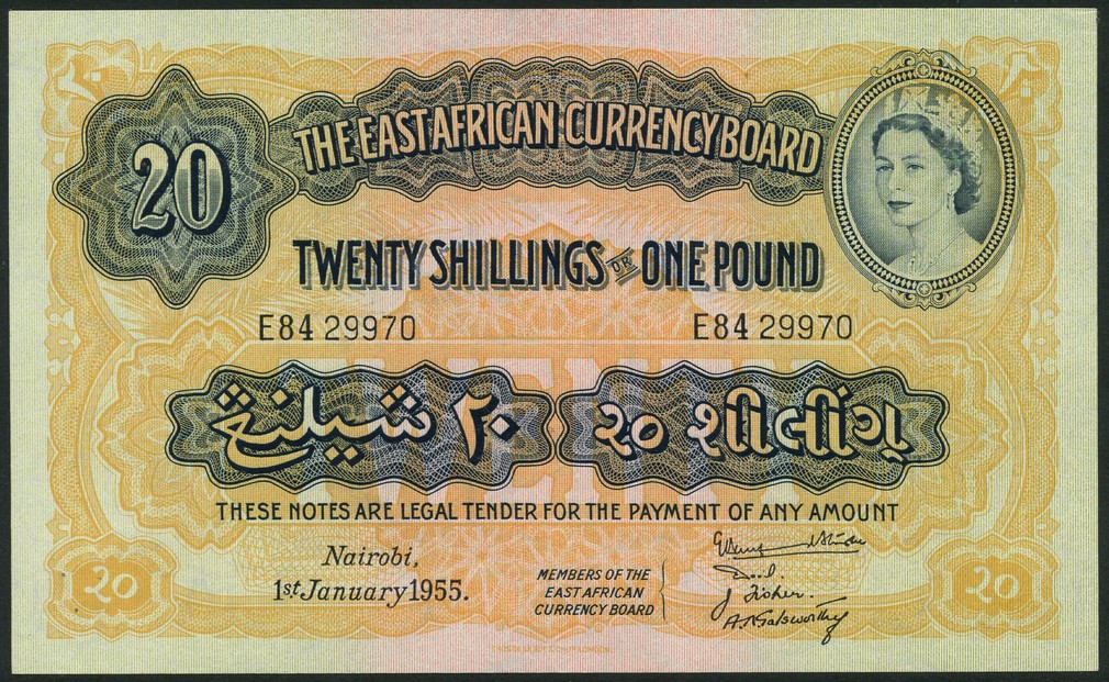 East African Currency Board, 20 shillings (2), 1 January 1955 and 1 February 1956, prefixes E84 and H20, dark blue on yellow and multicolour underprint, Elizabeth II at top right, value at centre, top left and each corner, reverse orange, lion at centre