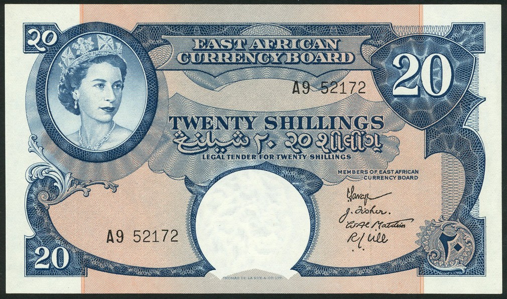 East African Currency Board, 20 shillings, ND (1958), serial number A9 52172, blue on tan and blue underprint, Elizabeth II at top left, value at centre and each corner