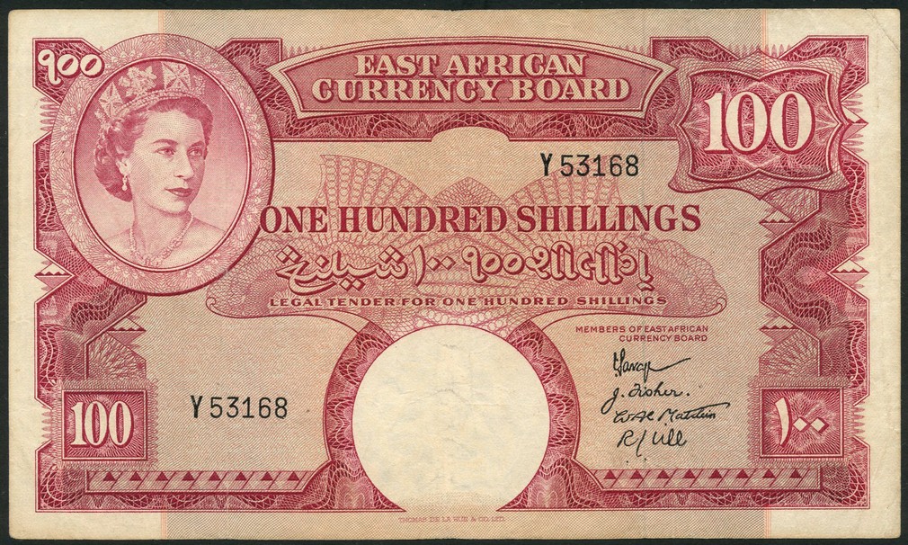 East African Currency Board, 100 shillings, ND (1958), serial number Y 53168, red on multicolour underprint, Elizabeth II at top left, value at centre and each corner