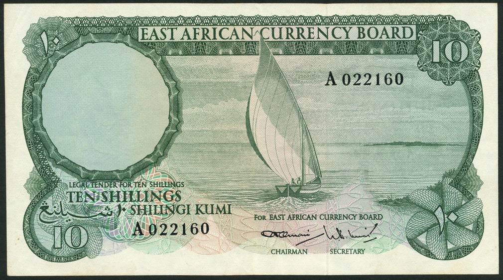 East African Currency Board, 5 and 10 shillings, ND (1964), serial numbers R918312 and A022160, brown and green respectively, sailing boat on Lake Victoria at centre, value at each corner, reverse coffee plant, palm tree and flowers