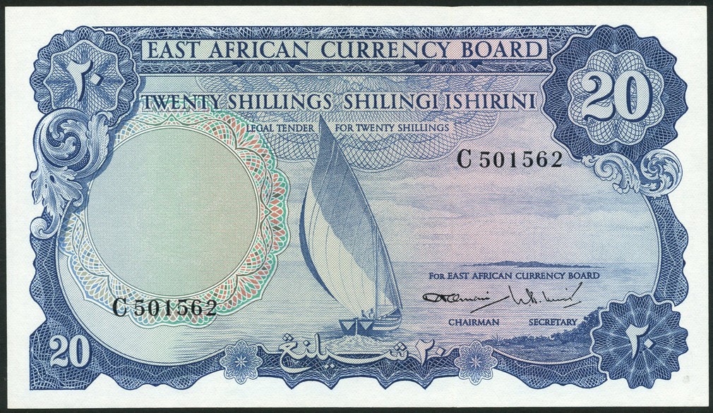 East African Currency Board, 20 shillings, ND (1964), serial number C501562, blue on multicolour underprint, sailing boat on Lake Victoria at centre, value at each corner, reverse blue, coffee plant, palm tree and flowers