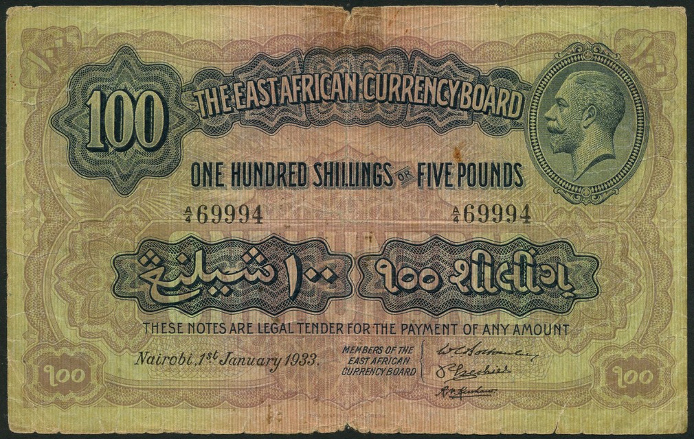 (x) East African Currency Board, 100 shillings, 1 January 1933, serial number A/469994, blue black on green and lilac underprint, portrait King George V at right, reverse, mauve, lion at centre