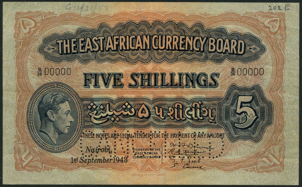 (†) The East African Currency Board, specimen 5 Shillings, 1 September 1943, serial number B/36 00000, four signatures, blue-black on brown and orange underprint, portrait of King George VI at lower left, value in guilloche at lower right, reverse orange-brown, lion at centre, value in each corner, with TDLR imprint, perforated CANCELLED