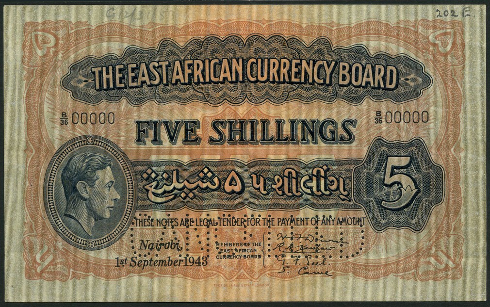East African Currency Board, 5 shillings, 10 shillings and 20 shillings, 1 September 1943, dark blue on orange, green and yellow respectively, George VI at left, value at right and each corner, reverse lion at centre