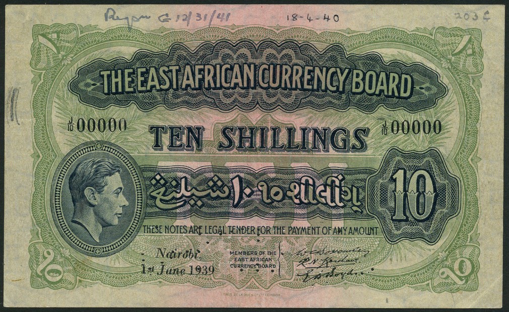 (†) The East African Currency Board, specimen 10 Shillings, 1 June 1939, serial number J/10 00000, three signatures, blue-black and green on pink underprint, portrait of King George VI at lower left, value in guilloche at lower right, reverse green, lion at centre, value in each corner, perforated CANCELLED