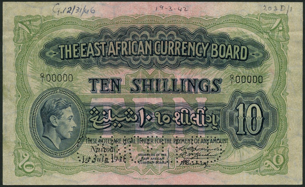 (†) The East African Currency Board, specimen 10 Shillings, 1 July 1941, serial number Q/1 00000, three signatures, blue-black and green on pink underprint, portrait of King George VI at lower left, value in guilloche at lower right, reverse green, lion at centre, value in each corner, perforated CANCELLED