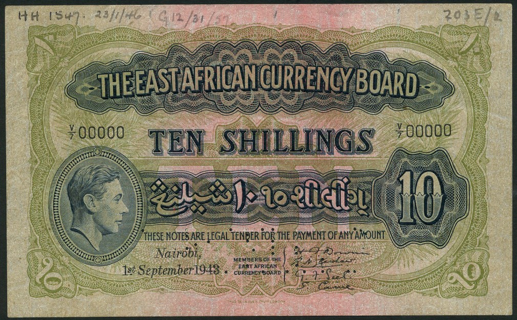 (†) The East African Currency Board, specimen 10 Shillings, 1 September 1943, serial number V/7 00000, four signatures, blue-black and green on pink underprint, portrait of King George VI at lower left, value in guilloche at lower right, reverse green, lion at centre, value in each corner, perforated CANCELLED
