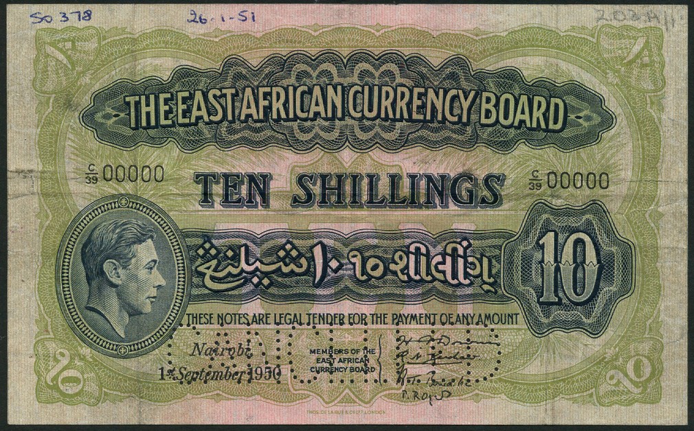 (†) The East African Currency Board, specimen 10 Shillings, 1 September 1950, serial number C/39 00000, four signatures, blue-black and green on pink underprint, portrait of King George VI at lower left, value in guilloche at lower right, reverse green, lion at centre, value in each corner, perforated CANCELLED