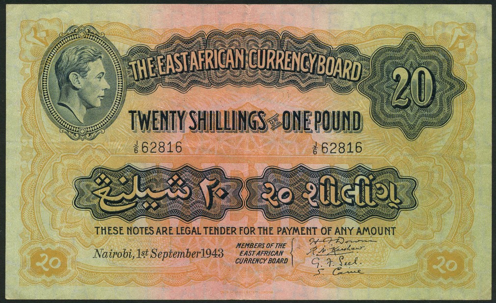 (x) East Africa Currency Board, 10 shillings, 1 July 1941, prefix N/5, green and lilac, also 20 shillings, 1 September 1943, prefix J/6, orange-brown, both George VI at left
