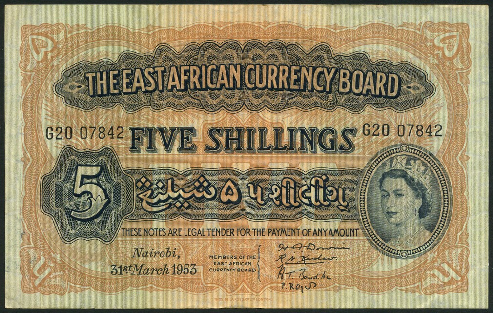 East African Currency Board, 5 shillings (2), 31 March 1953, 1 January 1955, brown, Elizabeth II at right, value at left, reverse pink, lion at centre