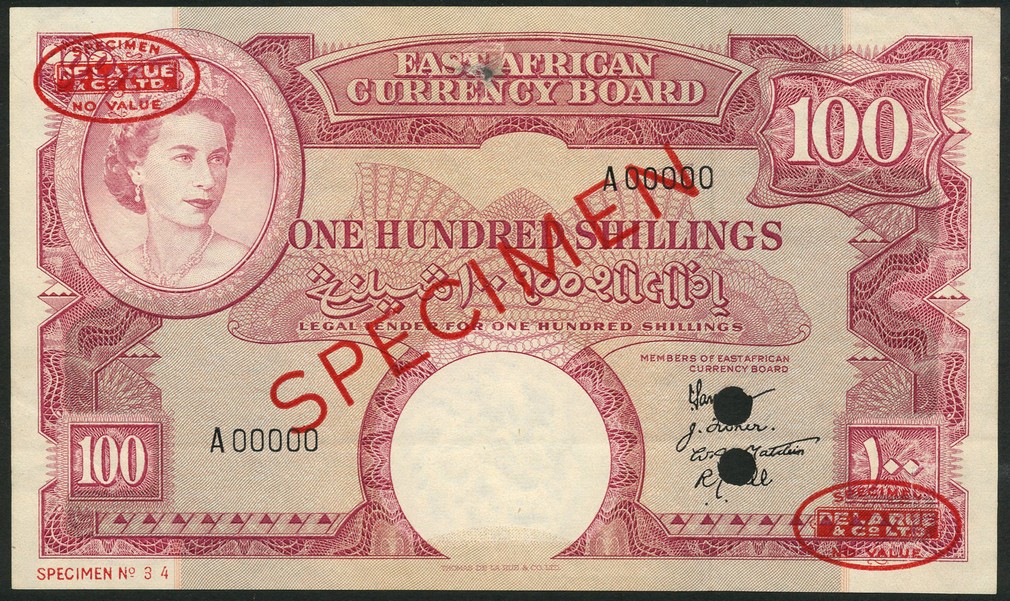 (x) East Africa Currency Board, specimen 100 shillings, ND (1958), serial number A 00000, red and beige, Elizabeth II at top left