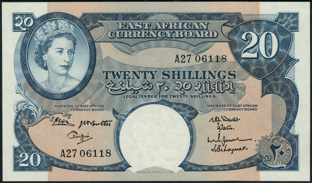 (x) East Africa Currency Board, 20 shillings, ND (1962-1963), prefix A27, blue and pale pink, Elizabeth II at top left, value at right