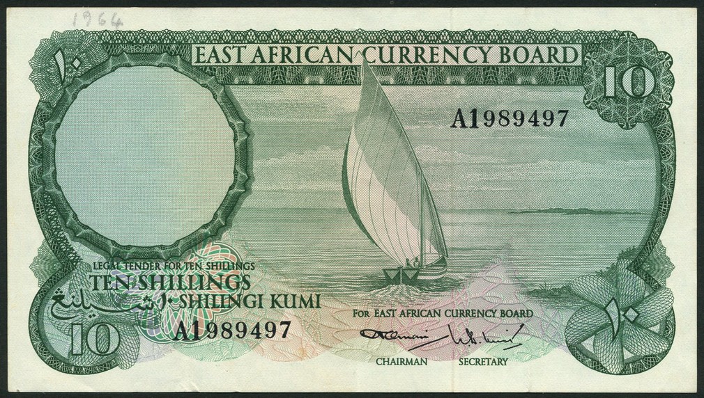 East African Currency Board, 10 shillings (2), ND (1964), consecutive serial numbers A1989497/8, green on multicolour underprint, sailing boat at centre, value in each corner at at low left, reverse, green, various plants in circular frames at centre