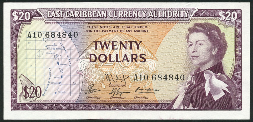 East Caribbean Currency Authority, $20, ND (1983), serial number A10 684840, purple and multicoloured, Elizabeth II at right, turtles at centre, signature 9, reverse purple, coastline