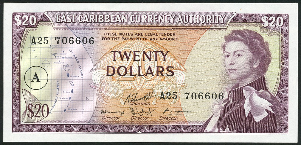 East Caribbean Currency Authority, $20, ND (1983), Antigua and Barbuda, prefix A25, purple and multicoloured, Elizabeth II at right, turtles at centre A in field, reverse purple, coastline