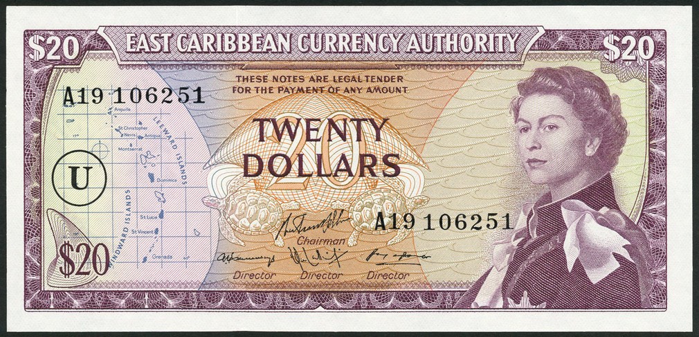 East Caribbean Currency Authority, $20, ND (1983), Anguilla, prefix A19, purple and multicoloured, Elizabeth II at right, turtles at centre U in field, reverse purple, coastline