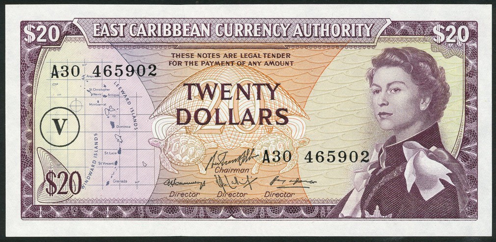 East Caribbean Currency Authority, $20, ND (1983), Saint Vincent and the Grenadines, prefix A30, purple and multicoloured, Elizabeth II at right, turtles at centre V in field, reverse purple, coastline