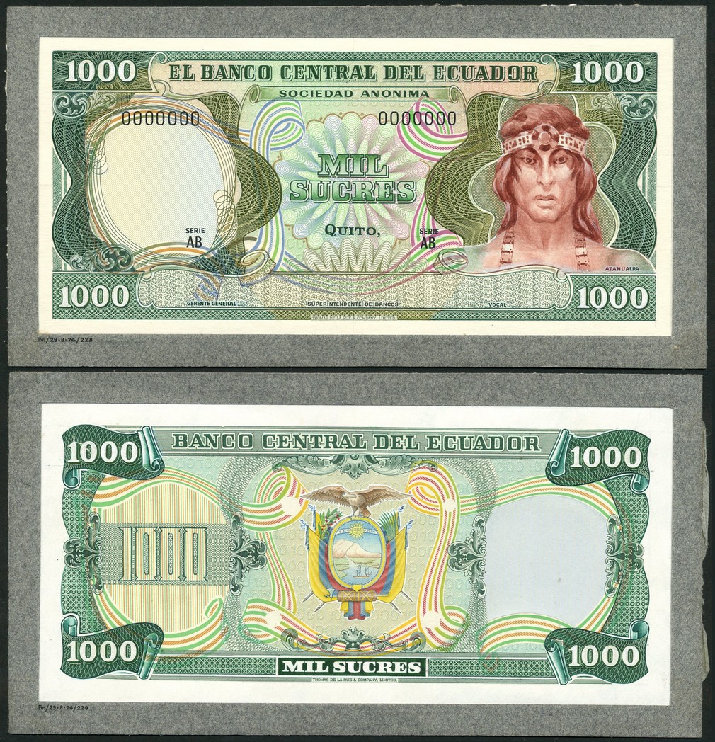 (†) El Banco Central del Ecuador, a printers archival essay for the obverse and reverse of a 1000 sucres, ND (1974), zero serial numbers, green and multicoloured, Indian (Atahualpa) at right, reverse green, arms at centre, value at left and at each corner