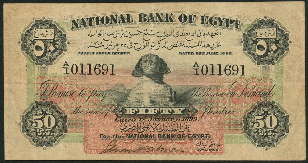 National Bank of Egypt, 50 piastres, 1 January 1899, serial number A/1 011691, black on pink and green underprint, the Sphinx at centre, value at centre and at each corner, reverse green, value at left and right, Palmer signature
