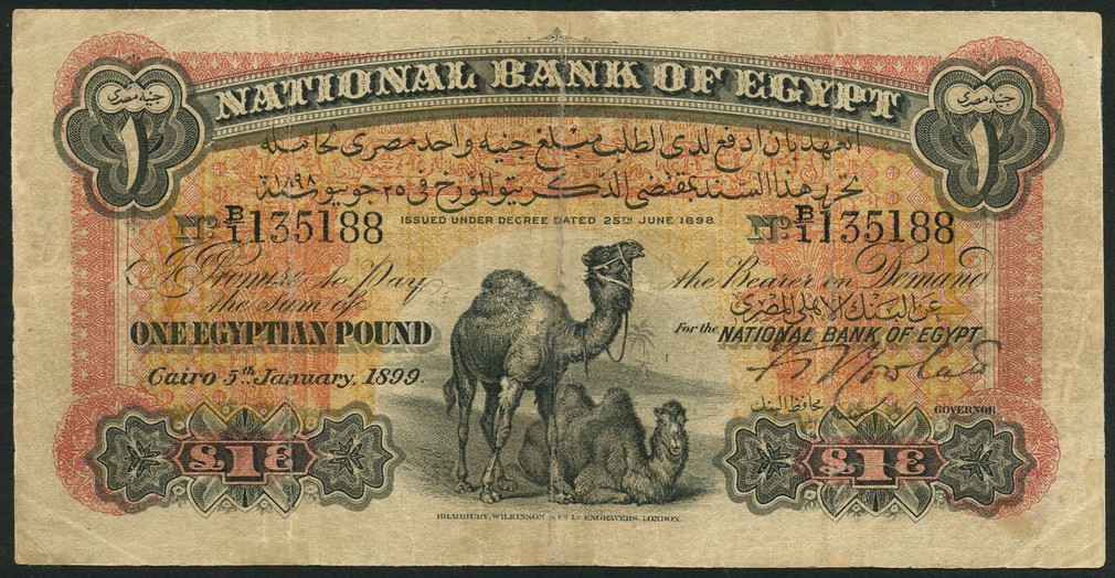 National Bank of Egypt, £1, 5 January 1899, serial number B/1 135188, black, white and pale orange-red, two camels at centre, value at left and each corner, Rowland signature at right, reverse orange-brown, value at left and right