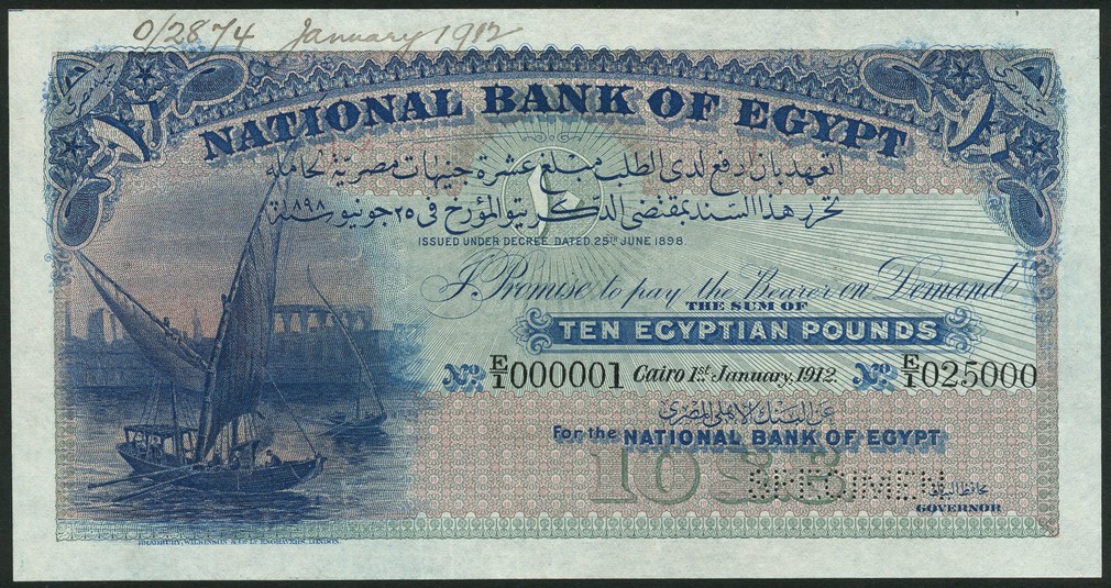 (†) National Bank of Egypt, printers archival specimen 10 pounds, 1 January 1912, serial number range E/1 000001- E/1 025000, blue on pink-brown and green underprint, Temple at Philae with two dhows at left, value at top centre and corners, and low right in underprint, reverse teal, value at left, perforated SPECIMEN