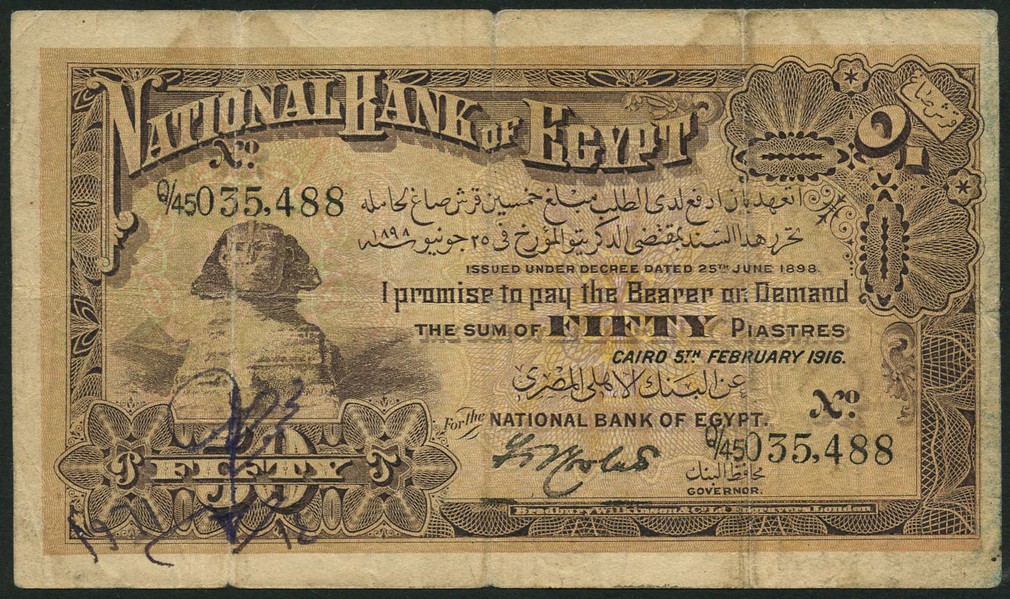 National Bank of Egypt, 50 piastres, 5 February 1916, serial number Q/45 035,488, brown, Sphinx at left, denomination in Arabic at top right and Western low left, reverse green and blue