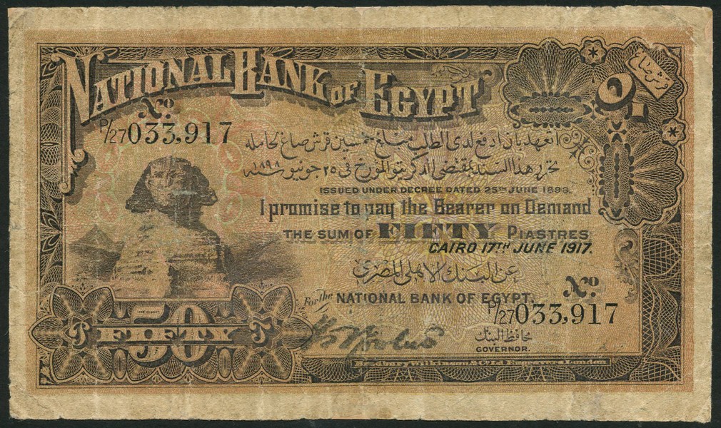 National Bank of Egypt, 50 piastres (2), 17 June 1917 and 17 May 1918, serial numbers P/27 033,917 and P/37 038,826 respectively, brown, Sphinx at left, denomination in Arabic at top right and Western low left, reverse green and blue