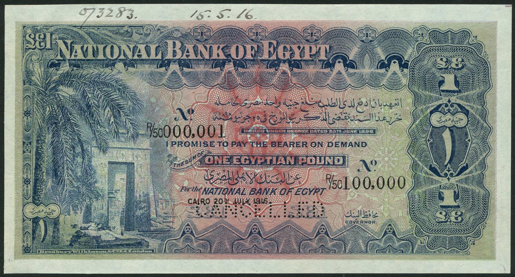 (†) National Bank of Egypt, printer's archival specimen 1 Pound (2), 19 July 1916, serial number runs R/49 000001-100000 and R/50 000001-100000, blue on pink and pale green underprint, the temple gate of Khonsu at Karnak at left, value in western and Arabic numerals at right, without signatures, reverse dark green on orange and pale green underprint, value in ornate pattern,