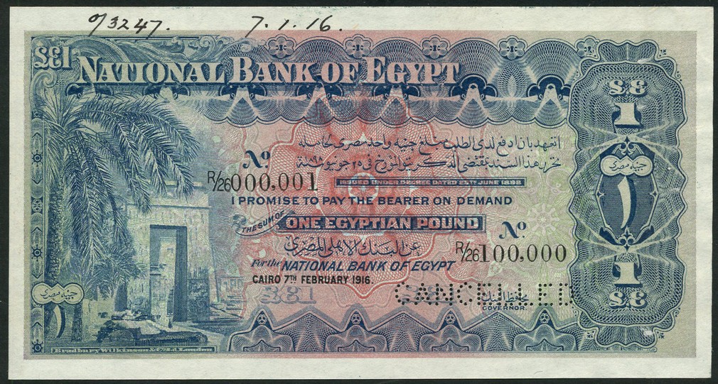 National Bank of Egypt, specimen 1 pound, 7 February 1916, prefix R/26, blue on pink and light green underprint, Temple Ruins at Karnak at left, value at right and each corner