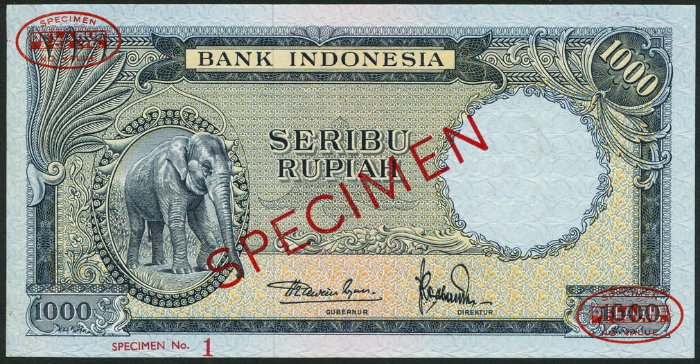 (†) Bank Indonesia, specimen 500 Rupiah, ND (1957), serial number 500A 0000, brown, tiger at left, reverse green, paddy terraces and buffalos; specimen 1000 Rupiah, ND (1957), serial number 1000A 0000, blue, elephant at left, reverse brown, fisherman; also specimen 500 Rupiah (2), 1 January 1959, serial numbers 500A 0000 and 500UBM 0000, blue, flowers, reverse red, crested fireback; specimen 1000 Rupiah, 1 January 1959, serial number 1000A 0000, olive-green and multicoloured, flowers, reverse blue, bird of paradise, all overprinted SPECIMEN in red with two De La Rue specimen ovals on obverse and reverse, two punch holes