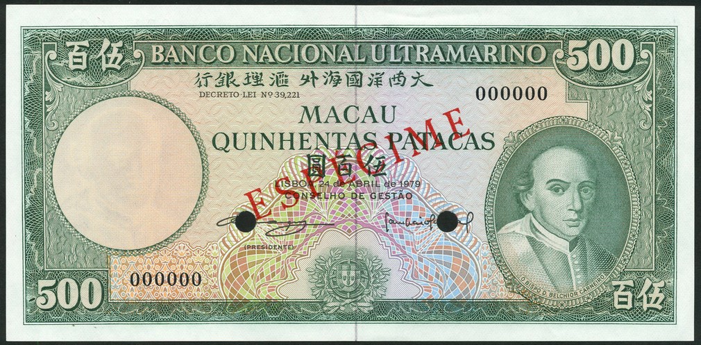 (†) Banco Nacional Ultramarino, Macau, printer's archival specimen 500 Patacas, 8 April 1963, serial run 005601 to 006800; and specimen 500 Patacas, 24 April 1979, serial number 000000, both green on multicoloured underprint, portrait of Bishop Belchior Carneiro at lower right, reverse woman looking out at ships, the first perforated SPECIMEN, the second overprinted ESPECIME in red on obverse and reverse, two punch holes