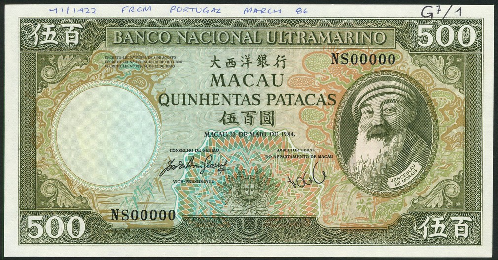 (†) Banco Nacional Ultramarino, Macau, specimen 10 Patacas, ND (c.1981), no serial numbers, no signatures, brown on multicoloured underprint, lighthouse at right, one punch hole; specimen 100 Patacas,12 May 1984, serial number NX75000, blue and multicoloured, portrait of Camilo Pessanha at right, overprinted ESPECIME in red on obverse and reverse; and specimen 500 Patacas, 12 May 1984, serial number NS00000, olive-green, portrait of De Morais at right, all reverse harbour scene