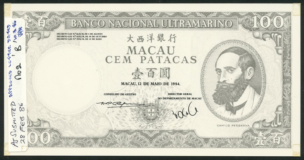 (†) Banco Nacional Ultramarino, Macau, a black and white uniface bromide photographic print with overlay trace for a 100 Patacas, 12 May 1984, no serial number, portrait of Camilo Pessanha at right