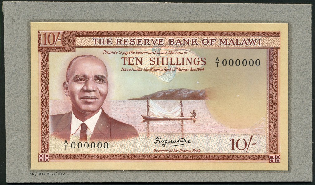 (†) Reserve Bank of Malawi, an obverse composite essay on board for a 10 shillings, ND (1963), serial number A/1000000, purple-brown, President Banda at left, fishermen at centre