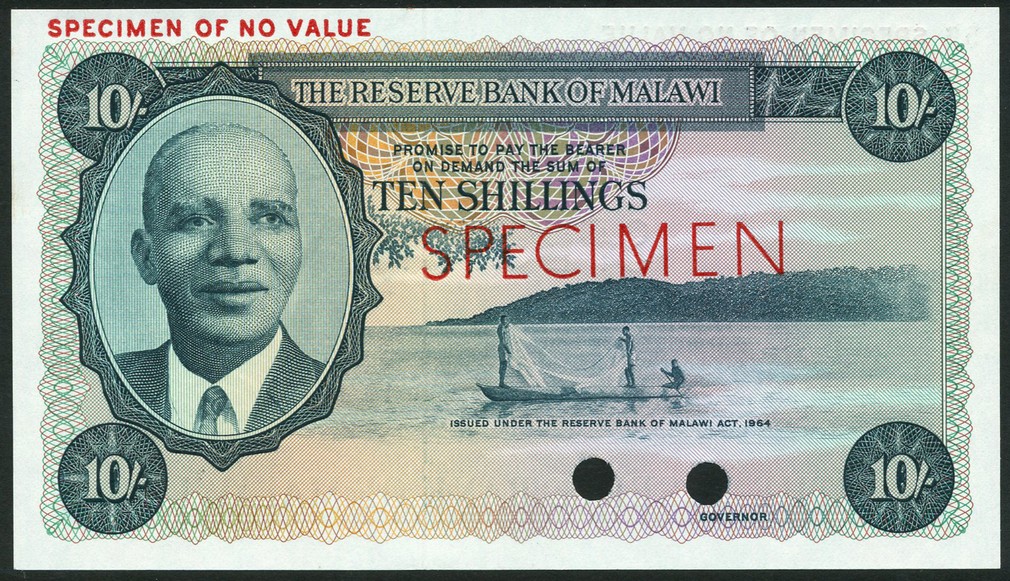 (†) Reserve Bank of Malawi, specimen colour trial 10 Shillings, Law of 1964, no serial numbers, no signatures, blue-green on multicoloured underprint, portrait of Hastings Banda at left, fishermen in boat on Lake Malawi at centre, value in each corner, reverse tobacco harvesting, overprinted SPECIMEN in red on obverse and reverse, two punch holes