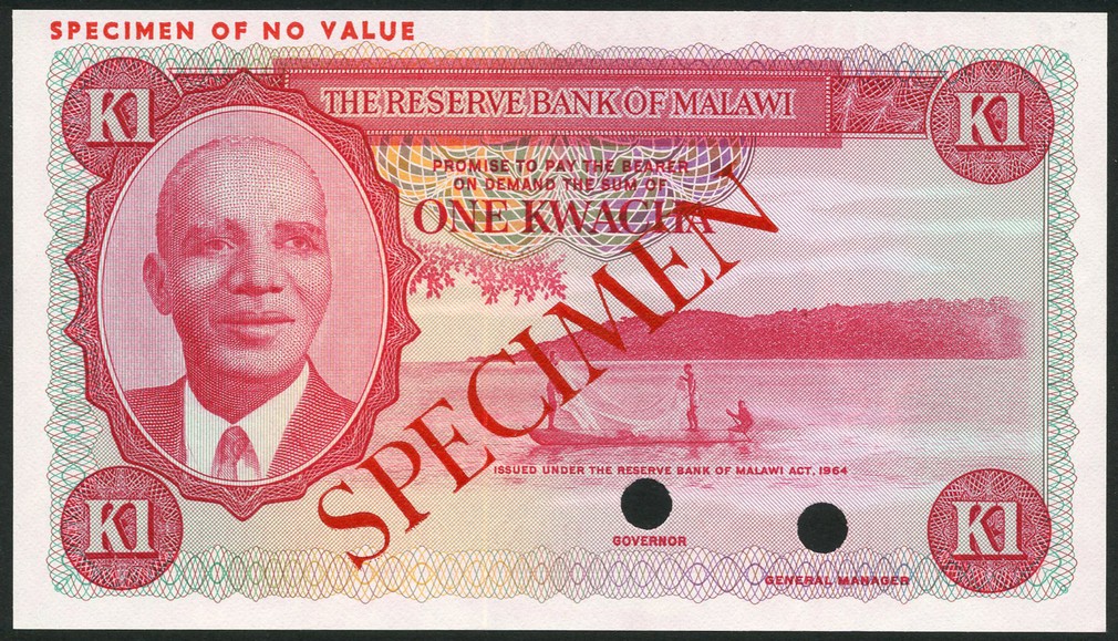 (†) Reserve Bank of Malawi, specimen colour trial 1 Kwacha, Law of 1964 (1971), no serial numbers, no signatures, red on multicoloured underprint, portrait of Hastings Banda at left, fishermen in boat on Lake Malawi at centre, value in each corner, reverse tobacco harvesting, overprinted SPECIMEN in red on obverse and reverse