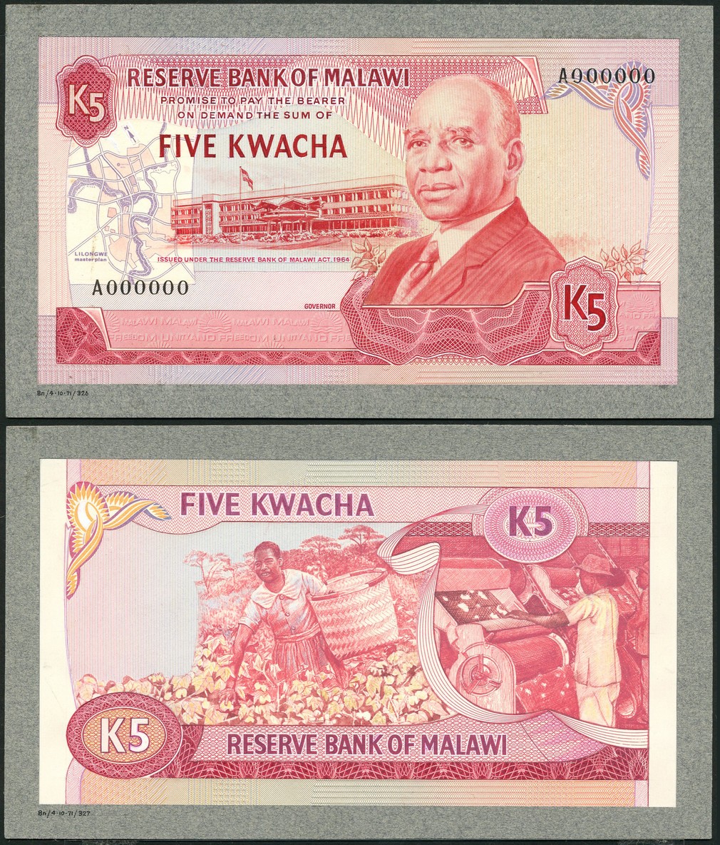 (†) Reserve Bank of Malawi, an obverse and reverse composite essay on card for a 50 tambala, ND (1971), grey-blue and for a 5 kwacha, ND (1971), red, both serial number A000000 and President Banda at right