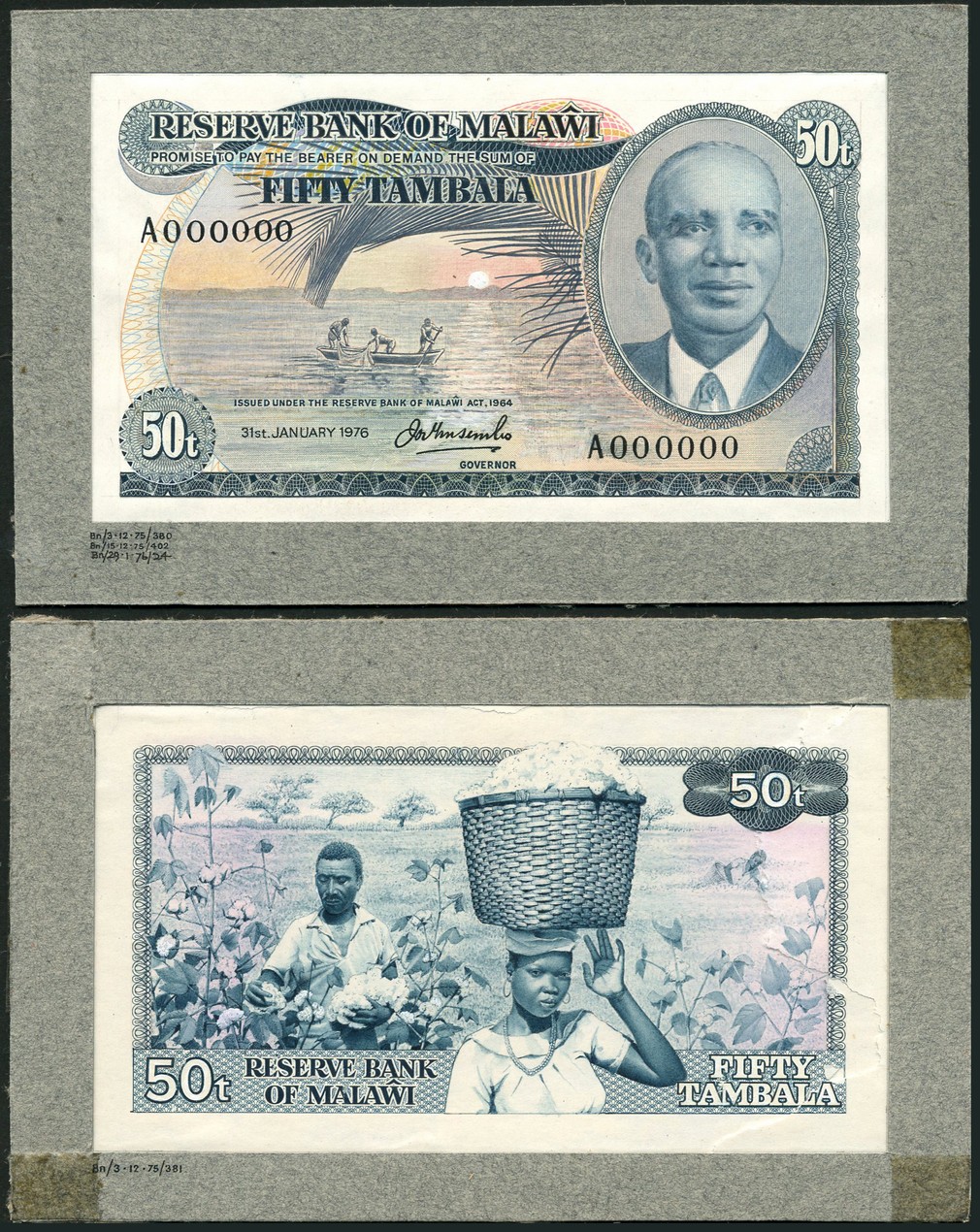 (†) Reserve Bank of Malawi, an obverse and reverse composite essay on card for a 50 Tambala, 31 January 1976, serial number A000000, blue-grey on multicoloured underprint, portrait of Hastings Banda at right, fishermen in boat on Lake Malawi at centre, reverse man and woman cotton harvesting; also a reverse composite essay on card for a 50 Tambala, ND (1975), blue-grey, woman and man cotton harvesting