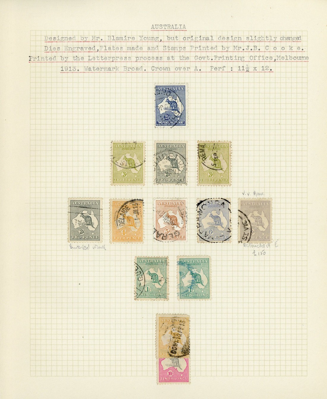 1913-36 used collection in an album including 1913 Kangaroo ½d. to 1/- including 2d. with watermark inverted and 6d. (faded) with retouched "e", 1913-14 engraved 6d. (3), 1915 2d. to 1/- with duplication, 1915-27 2d. to 5/- with duplication, good ranges of KGV Heads with much duplication of the low values, 1929-30 6d. to 2/-, 1931-36 Kangaroo 5/- (2) and 10/-, 1932 Bridge set, 1934 Victoria sets (both), Macarthur and 1935 Anzac; condition a little mixed though many are fine. Viewing recommended