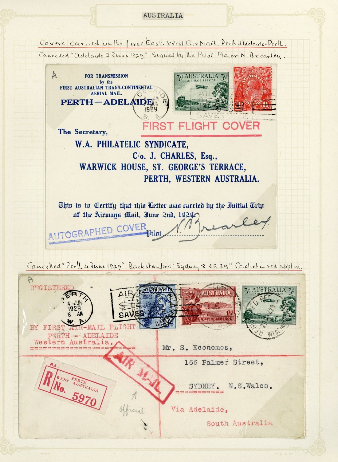 1929-35 air mail covers (18) including 1929 (April) Brisbane-Charleville with special vignette, 1931 (March) Melbourne-Sydney souvenir cover, 1931 (Nov.) Australia-England souvenir cover signed by Kingsford Smith, Rocket Mail, Vignettes with 1925 "Angel" sheet of fifteen, newspaper cuttings and notes, etc., chiefly fine