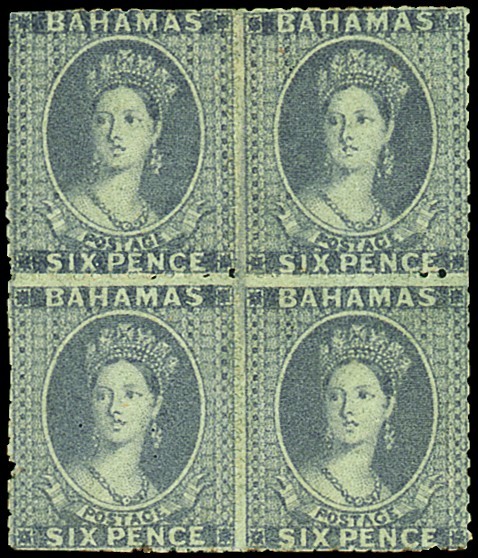 1862 no watermark, perf 13 6d. lavender-grey block of four, unused without gum; perfs. clipped or cut-off on all sides otherwise fine. A rare and remarkable multiple. S.G. 19, £13,000. Photo