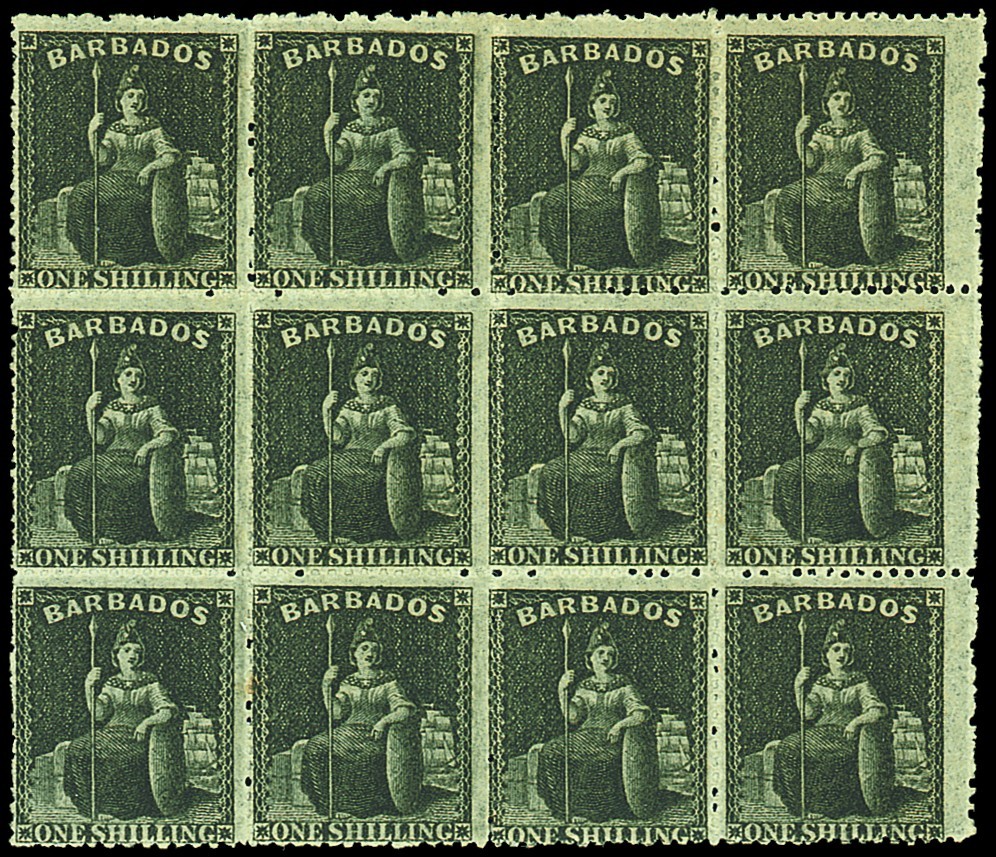 — 1/- black block of twelve (4x3), unused with large part original gum, some natural gum creases, fine. S.G. 35, £780. Photo