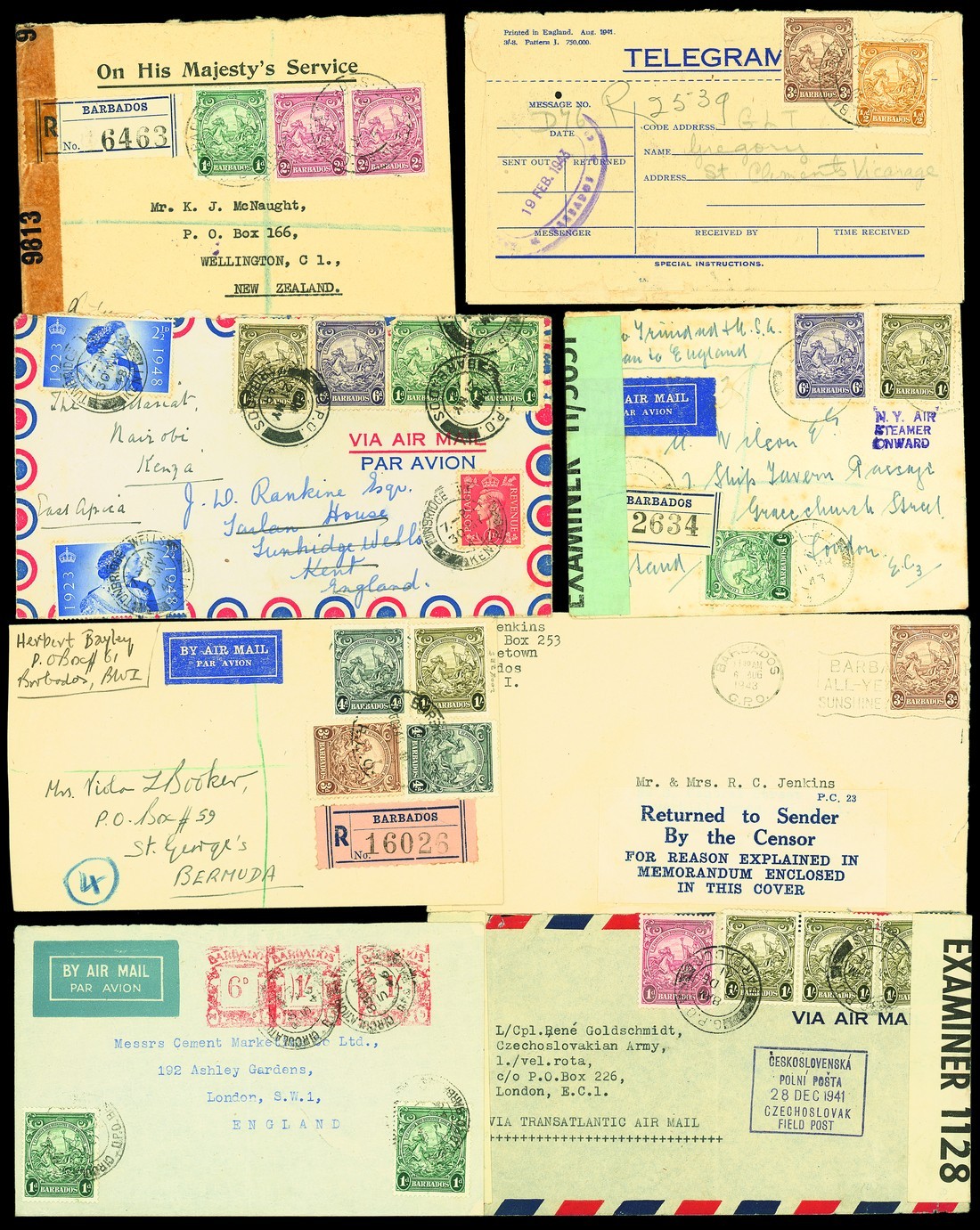 1938 Small Format Seal of the Colony issue covers, the award-winning eight-frame exhibit collection formed by the late Jerone R. Hart, all neatly mounted, well researched, written-up and presented in three Safe albums with slip cases, together with three further empty albums, contained in two cartons; the collection comprises an exceptional range of over 220 items arranged in ascending order of value from ½d. to 5/- and comprising a remarkable array of both single-value and multi-value frankings including Printed Matter, Surface, Post card, Airmail, Official, Registered and Censored and Foreign Destination Mail; items of note include registered to Kenya, printed matter to New Zealand, Pinto Labour Camp, Czech Army F.P.O., 2/6d. single franking on Official use, 5/- single frankings registered to England and Jamaica, shades, listed printing varieties on 2d., 2½d. and 4d. values are present with many very rare on cover. Viewing essential to fully appreciate the scope and depth of this wonderful lot. Photo