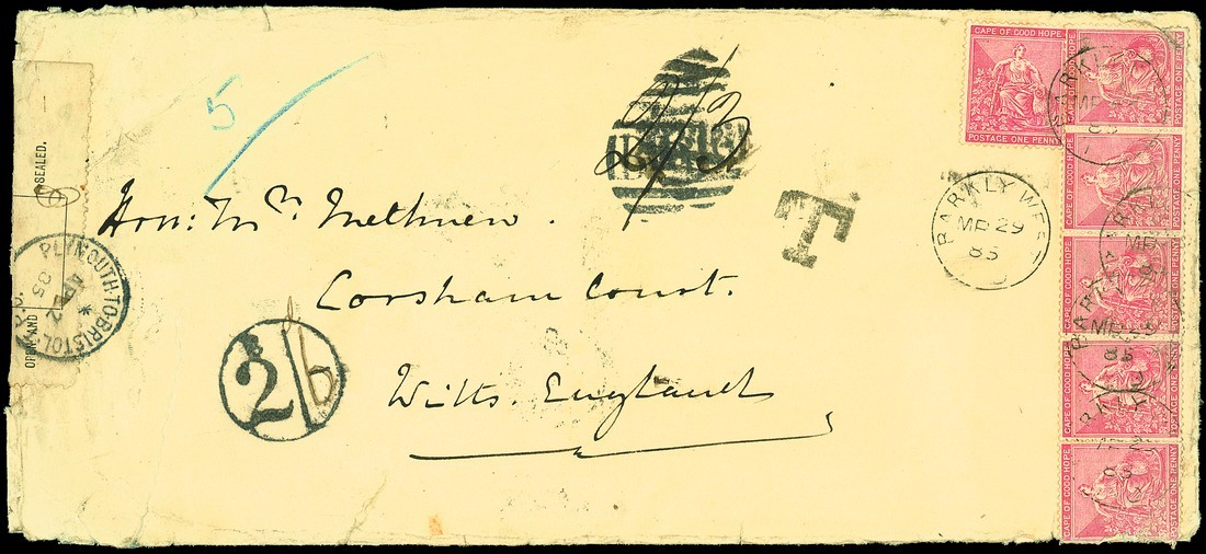 1885 (Mar.) long envelope (complete with photocopies of the contents) ex the Methuen correspondence from Setlagoli to his wife in England, bearing Cape 1d. red (6) cancelled by Barkly West c.d.s. (28.3) and showing "T" handstamp alongside manuscript "2/3" deleted with two "B16" obliterators, circular framed "2/-" altered to "2/6d" in manuscript and with Found Open and Officially Sealed label at left cancelled by Plymouth to Bristol T.P.O. c.d.s. (22.4), the reverse with Cape Town (1.4) and arrival (22.4) c.d.s.; the envelope with small perimeter faults, not unusual for an item of this size. An unusual taxed item written from Goshen which bordered Stellaland and Transvaal. Photo