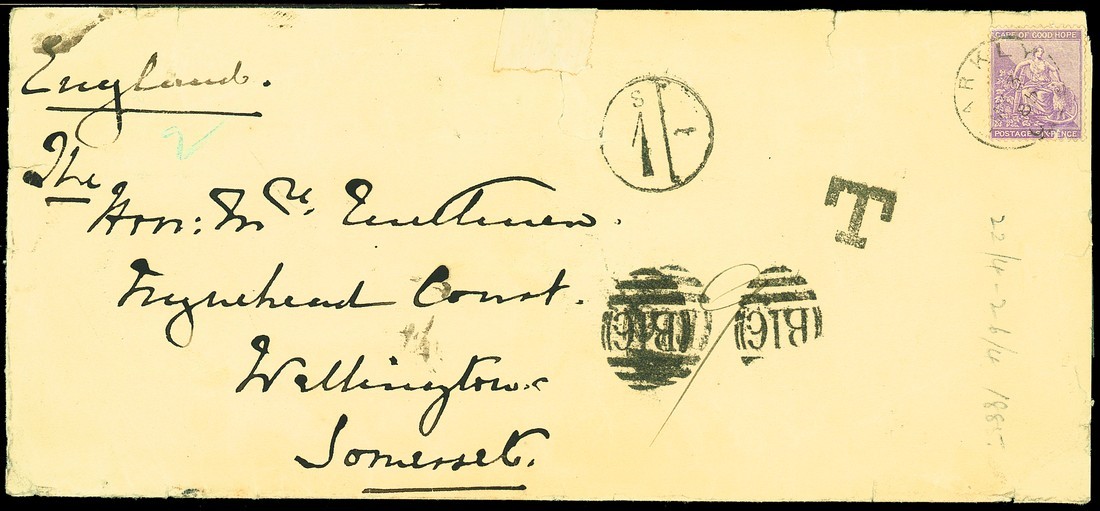 1885 (May) long envelope (small perimeter faults) ex the Methuen correspondence from Setlagoli to his wife in England, bearing Cape 6d. lilac cancelled by Barkly West c.d.s. (28.3) and showing "t" handstamp alongside manuscript "9" deleted with three Plymouth to Bristol T.P.O. "B16" obliterators, circular-framed "1/-" alongside, the reverse with Cape Town (6.5) and arrival (26.5) c.d.s. Photo
