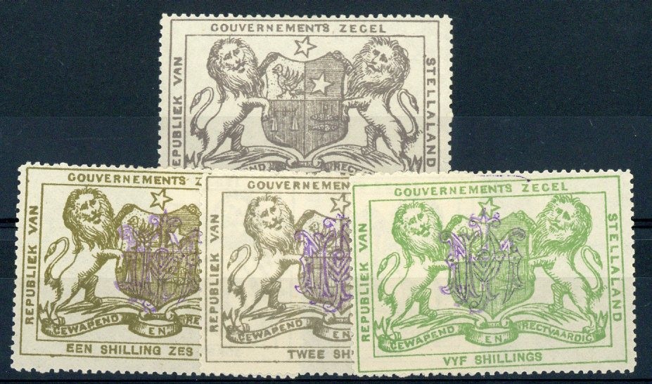 stellaland revenue stamps: 1884 2/6d. and 1886 with monogram handstamp 1/6d., 2/- and 5/-, mint; the first with a small thin, otherwise fresh and fine