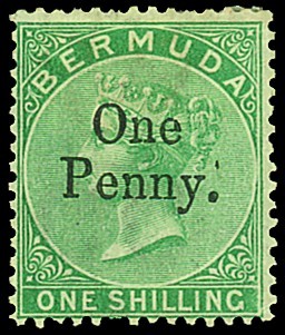 1875 "One/Penny." on 1/- green, one short perf. at foot otherwise fine unused with part original gum. S.G. 17, £500. Photo