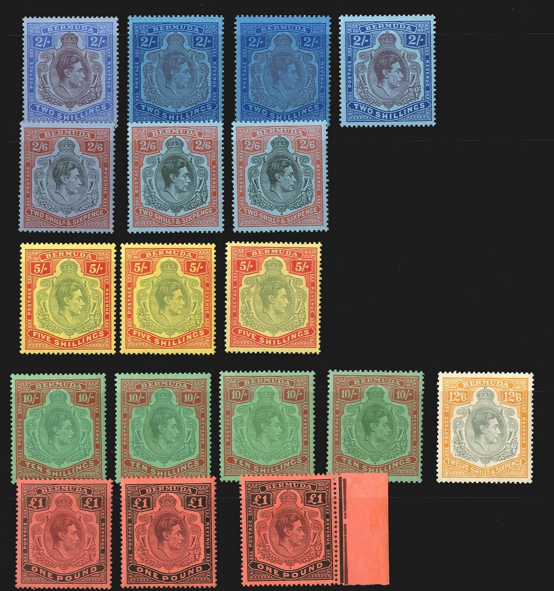 1938-53 perf. 14 2/- (4), 2/6d. (3), 5/- (3), 10/- (4), 2/6d. and £1 (3), various printings, fresh and fine mint